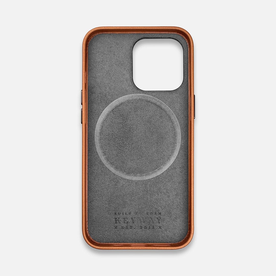 This premium Full Grain Leather iPhone 14 Pro MagSafe case features a fully wrapped Whiskey Brown design with metal accents, a microfiber lining, and the Keyway X-Mark. The oil-tan leather will develop a beautiful patina over time as you carry it along on all your travels. Just like a Keyway case, you were Built to Roam.